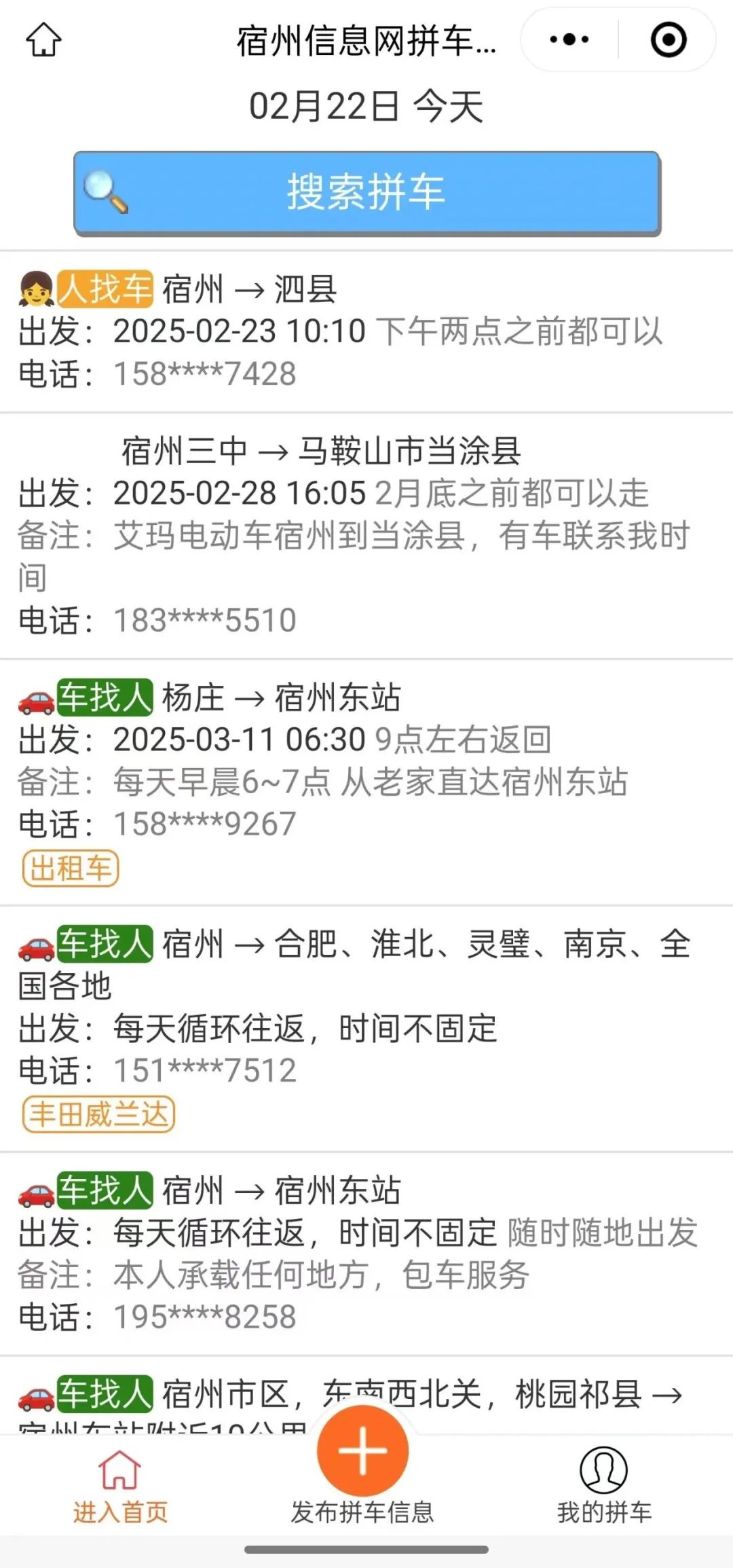 【宿州信息网长途拼车】今日宿州2502人在这里拼车出行,宿州→高铁站、合肥、南京